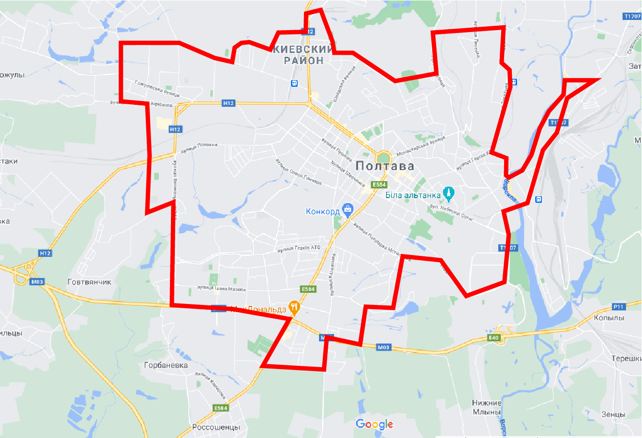 *Доставка за межами червоної лінії (як на фото зліва) вважається за містом і прораховується індивидуально.